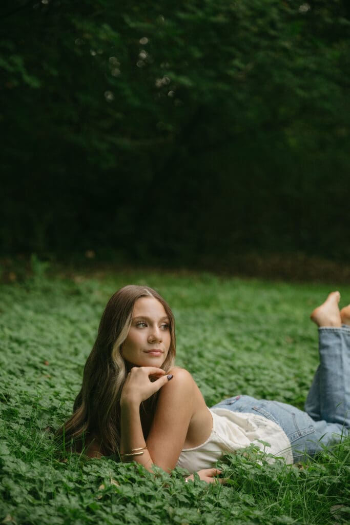 We considered several different locations but ultimately settled on using a family friend’s property so Audrey could have something completely unique for her photos. The property went deep into the forest but also had some beautiful patches of untouched clover that were an absolute dream to take photos with.